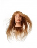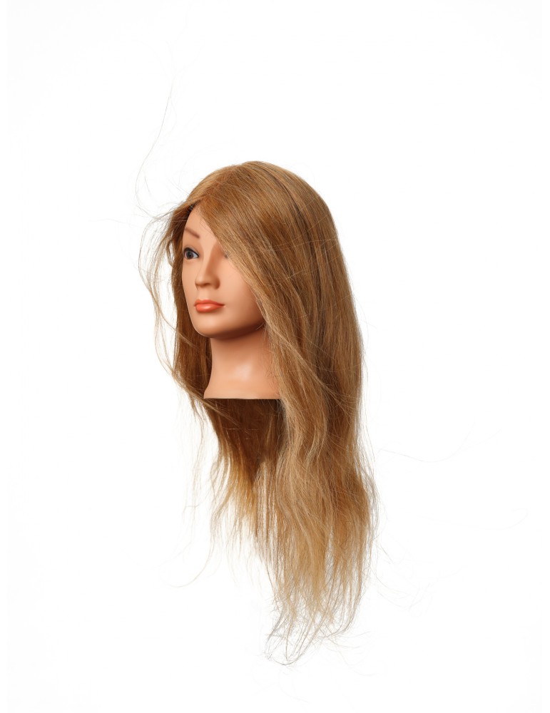 Female head model with 100% hand implanted human hair ideal for any kind of treatments. The lenght is ideal for coiffures and braiding.