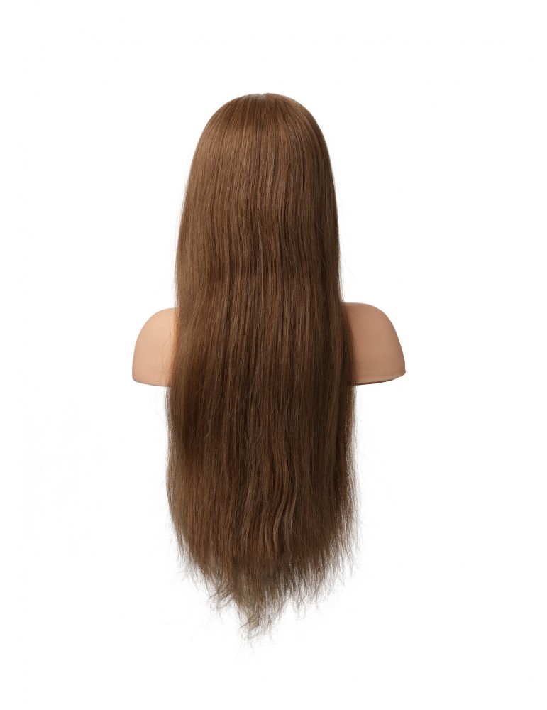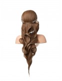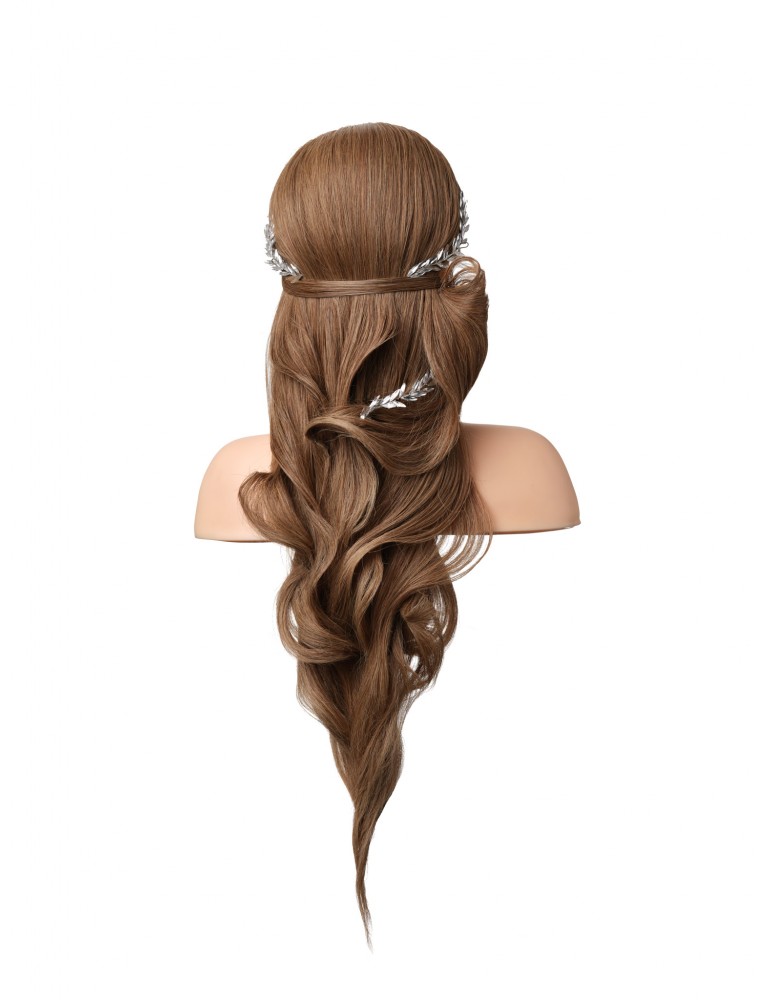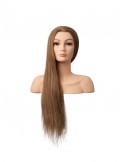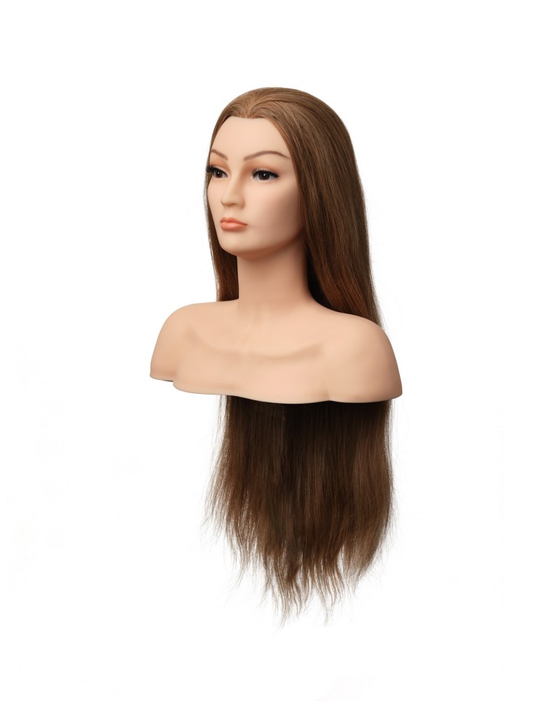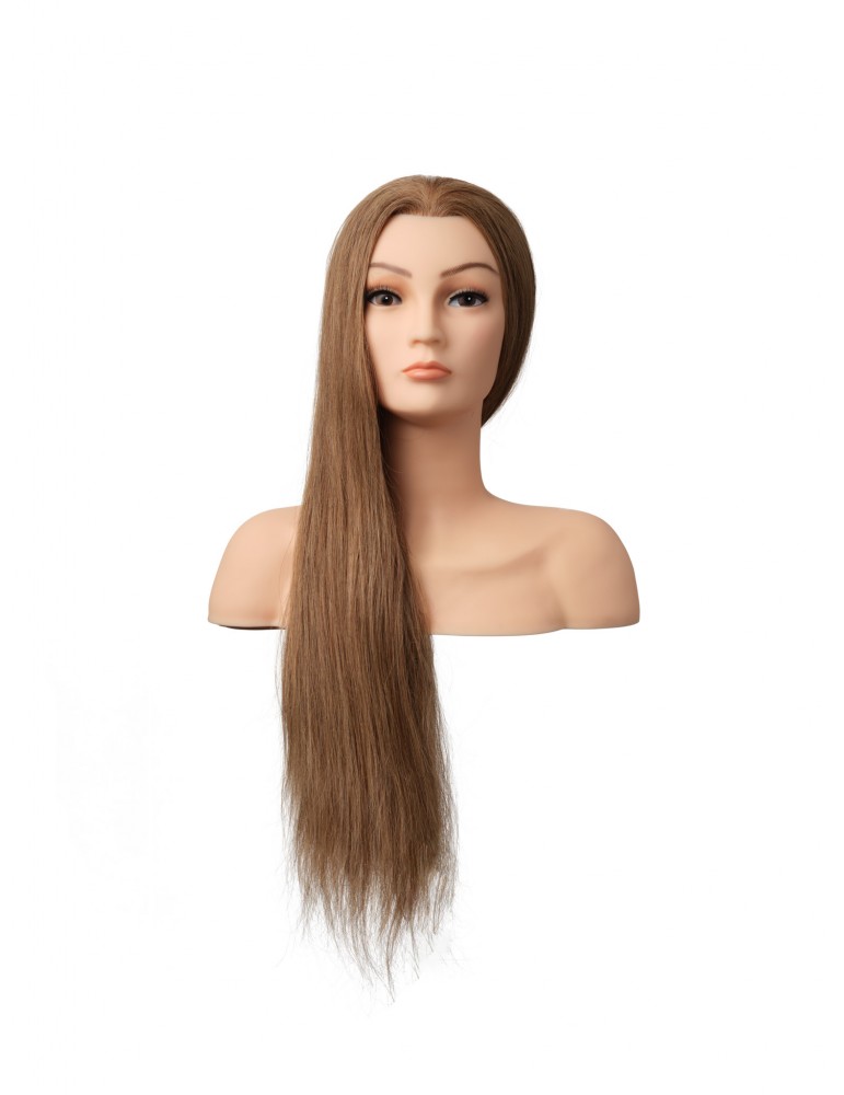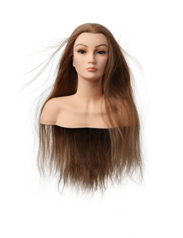 Female head model with shoulders, 100% natural hair implanted by hand of the highest quality with high hair density and length of 60 cm. Ideal for advanced hairstyles and competitions thanks to its beauty and high quality of hair.