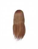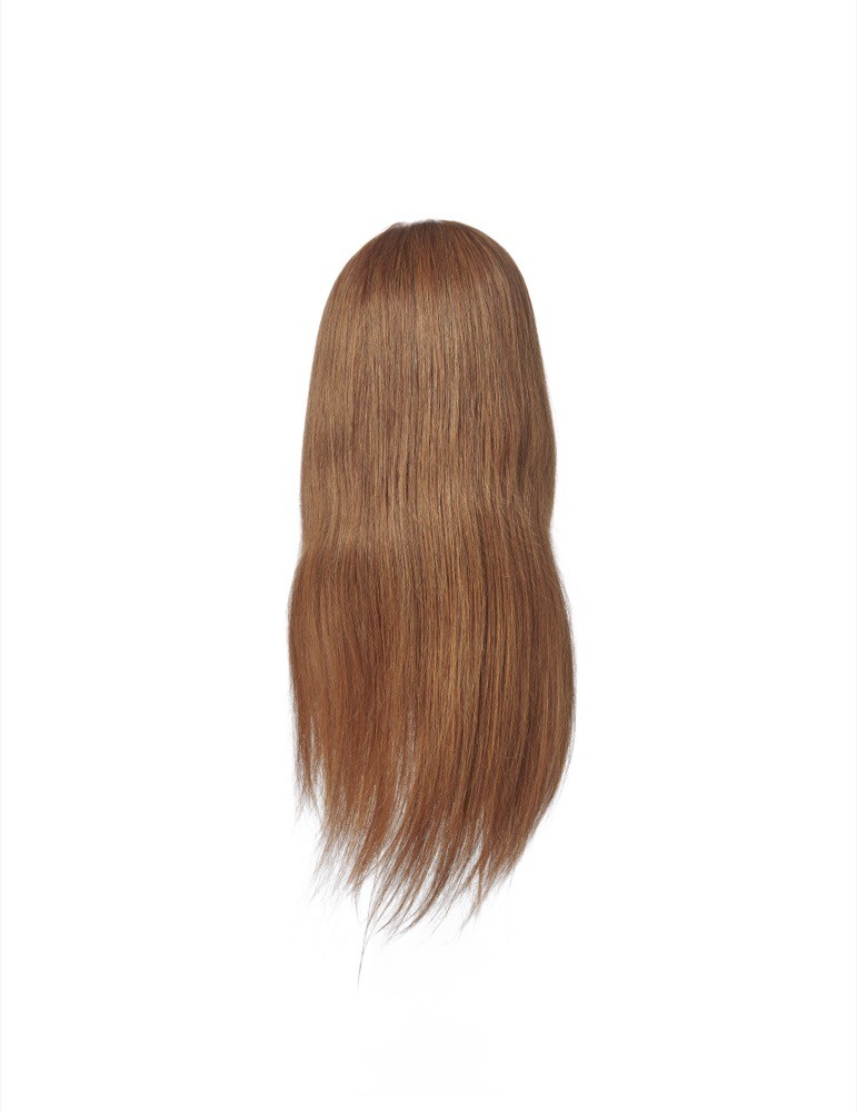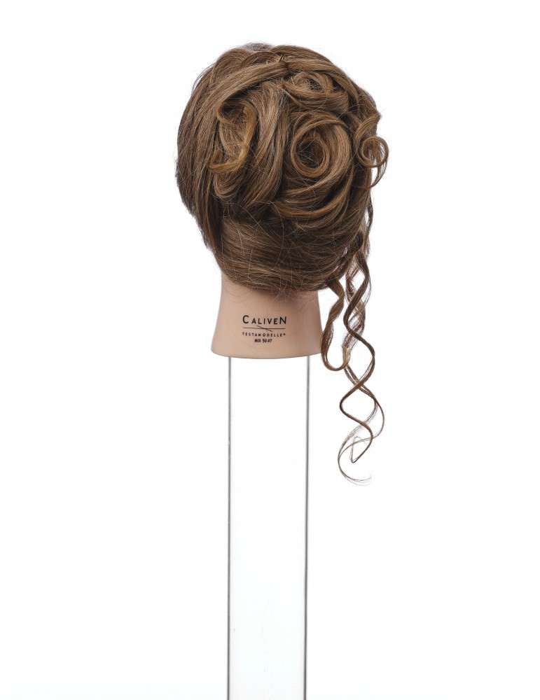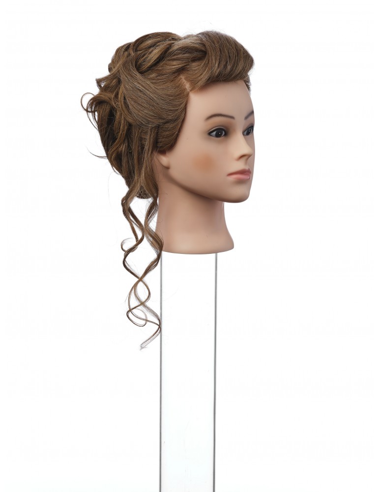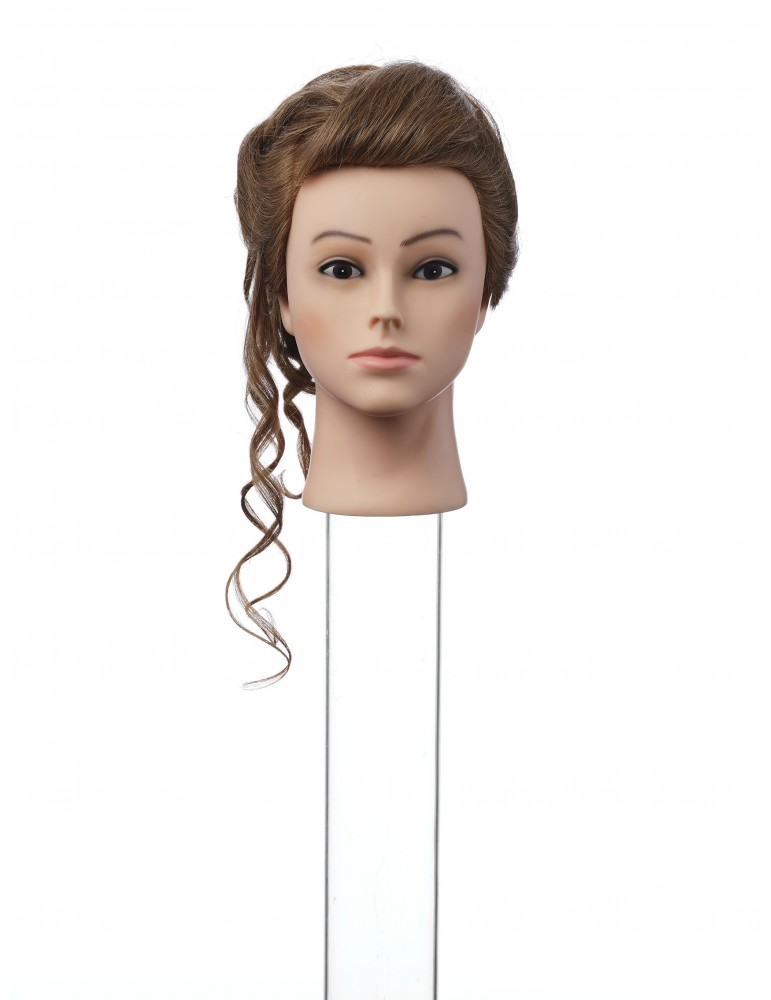 Female head mannequin with mixed hair: 50% human and 50% synthetic. The high quality synthetic fiber used in this model has great resistance to heat (max 180°). Ideal for cutting and coiffures. Unadvisable for bleeching, coloring and perms.