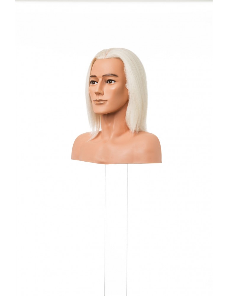 Testamodella maschile con spalle e capelli in 100% pelo naturale di capra. Il pelo di capra è naturalmente bianco, questo lo rende un materiale ideale per le lavorazioni di tinta più ambiziose. Molto simile al capello umano si presta benissimo allo stesso tipo di lavorazioni con ottimi risultati. Il modello con spalle è idoneo per la partecipazione a competizioni e gare.